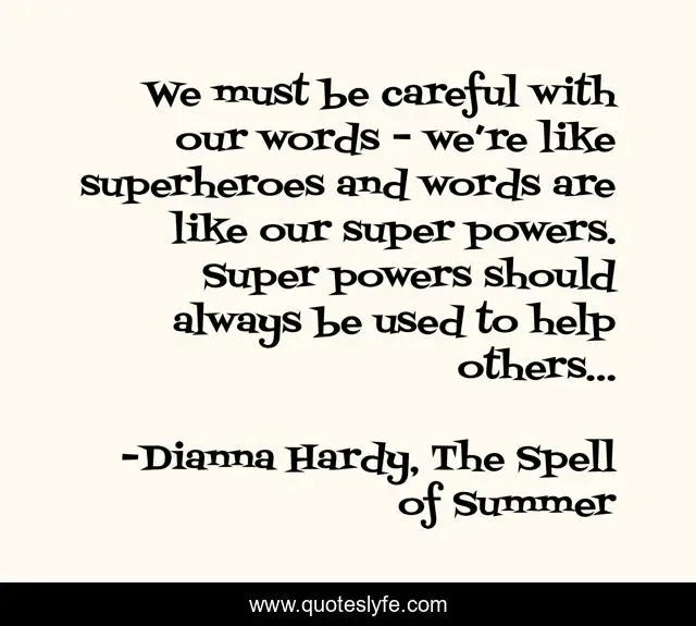 This page presents the quote "We must be careful with our words – we’re like superheroes and words are like our super powers. Super powers should always be used to help others…". Author of this quote is Dianna Hardy, The Spell of Summer. This quote is about words, super-powers, taking-care, life-lessons, helping-others, kindness, power-of-words, superheroes,.