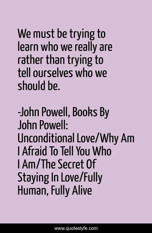 "John Powell, Books By John Powell: Unconditional Love/Why Am I Afraid To Tell You Who I Am/The Secret Of Staying In Love/Fully Human, Fully Alive Quotes." Quoteslyfe.com, 2025. Tue. 09 Dec. 2025. <https://www.quoteslyfe.com/quote/We-must-be-trying-to-learn-who-171213>.