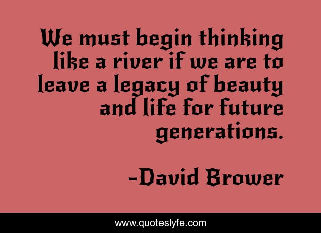 This page presents the quote "We must begin thinking like a river if we are to leave a legacy of beauty and life for future generations.". Author of this quote is David Brower. This quote is about thinking, legacy, river,.