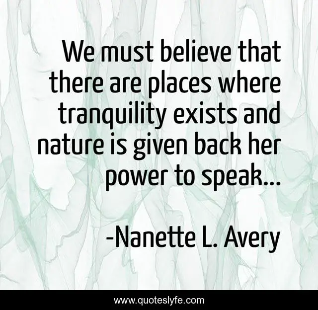 This page presents the quote "We must believe that there are places where tranquility exists and nature is given back her power to speak...". Author of this quote is Nanette L. Avery. This quote is about tranquility, mother-nature, quiet, nature,.