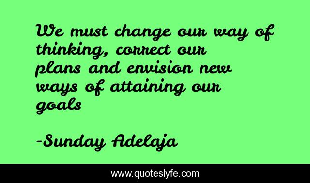 This page presents the quote "We must change our way of thinking, correct our plans and envision new ways of attaining our goals". Author of this quote is Sunday Adelaja. This quote is about change, goals, thoughts, wealth,.
