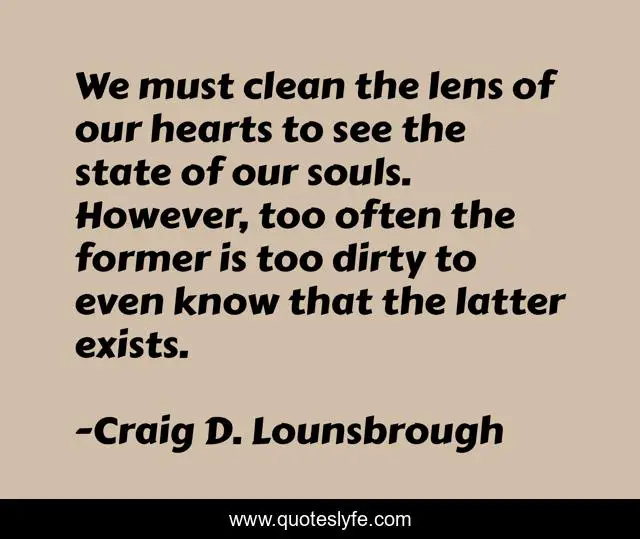 This page presents the quote "We must clean the lens of our hearts to see the state of our souls. However, too often the former is too dirty to even know that the latter exists.". Author of this quote is Craig D. Lounsbrough. This quote is about heart, insight, introspective, filthy, introspection, state, self-critical, awareness, perception,.