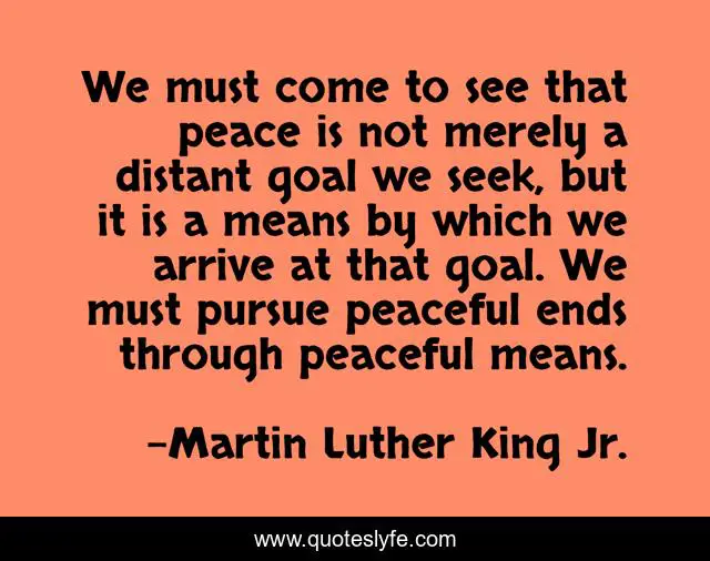 This page presents the quote "We must come to see that peace is not merely a distant goal we seek, but it is a means by which we arrive at that goal. We must pursue peaceful ends through peaceful means.". Author of this quote is Martin Luther King Jr.. This quote is about peace, wisdom,.