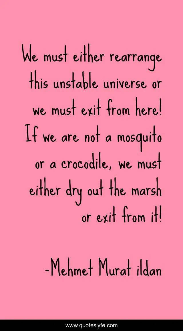 This page presents the quote "We must either rearrange this unstable universe or we must exit from here! If we are not a mosquito or a crocodile, we must either dry out the marsh or exit from it!". Author of this quote is Mehmet Murat ildan. .