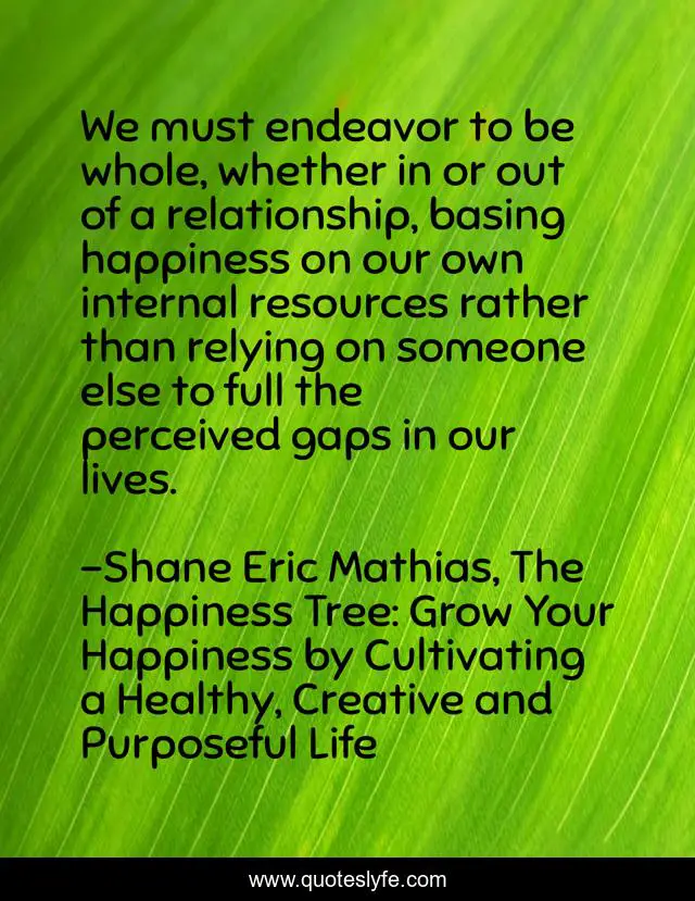 This page presents the quote "We must endeavor to be whole, whether in or out of a relationship, basing happiness on our own internal resources rather than relying on someone else to full the perceived gaps in our lives.". Author of this quote is Shane Eric Mathias, The Happiness Tree: Grow Your Happiness by Cultivating a Healthy, Creative and Purposeful Life. This quote is about emotional-strength, self-mastery, relationship, emotions, self-reliance, fear, wholeness,.