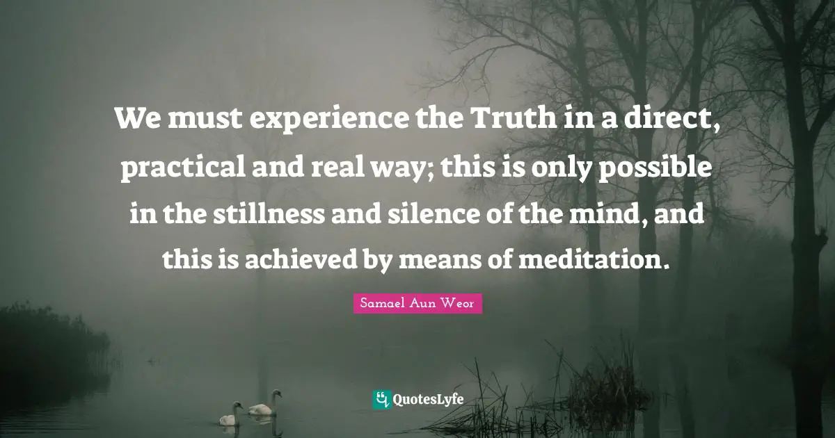 This page presents the quote "We must experience the Truth in a direct, practical and real way; this is only possible in the stillness and silence of the mind, and this is achieved by means of meditation.". Author of this quote is Samael Aun Weor. This quote is about direct, way, experience, meditation, mind, silence, truth, mean, real,.