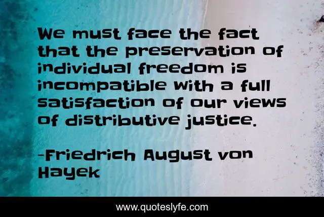 This page presents the quote "We must face the fact that the preservation of individual freedom is incompatible with a full satisfaction of our views of distributive justice.". Author of this quote is Friedrich August von Hayek. This quote is about justice, satisfaction, face,.
