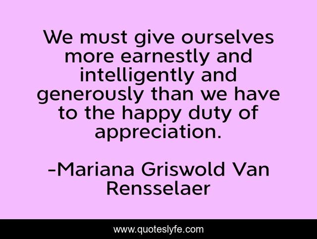 This page presents the quote "We must give ourselves more earnestly and intelligently and generously than we have to the happy duty of appreciation.". Author of this quote is Mariana Griswold Van Rensselaer. .