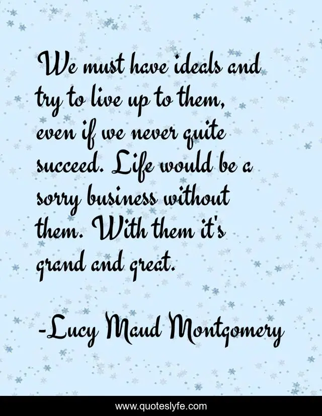This page presents the quote "We must have ideals and try to live up to them, even if we never quite succeed. Life would be a sorry business without them. With them it's grand and great.". Author of this quote is Lucy Maud Montgomery. This quote is about great, life, sorry,.