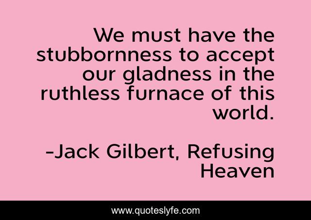 This page presents the quote "We must have the stubbornness to accept our gladness in the ruthless furnace of this world.". Author of this quote is Jack Gilbert, Refusing Heaven. .