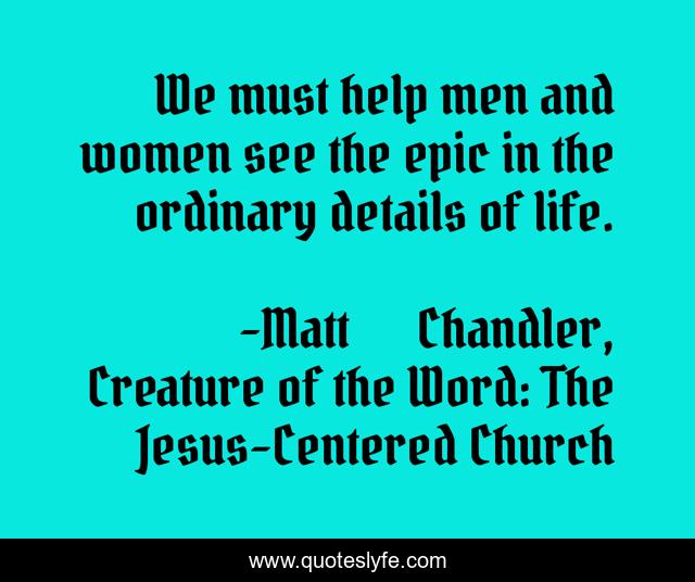 This page presents the quote "We must help men and women see the epic in the ordinary details of life.". Author of this quote is Matt Chandler, Creature of the Word: The Jesus-Centered Church. This quote is about spiritual-leadership, evangelism, disillusionment, boredom, discipleship, inspiration,.