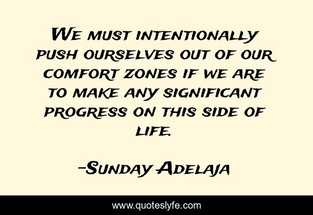 This page presents the quote "We must intentionally push ourselves out of our comfort zones if we are to make any significant progress on this side of life.". Author of this quote is Sunday Adelaja. This quote is about progress, life, comfort, significant,.