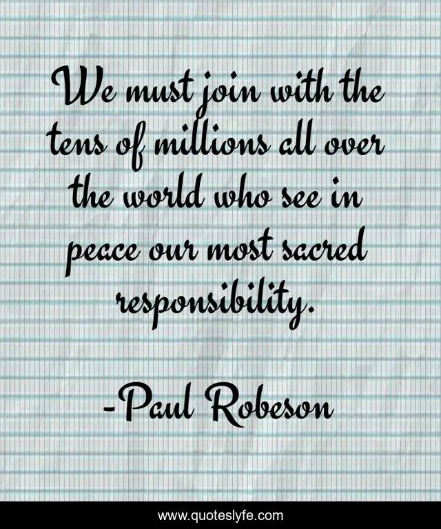 This page presents the quote "We must join with the tens of millions all over the world who see in peace our most sacred responsibility.". Author of this quote is Paul Robeson. This quote is about world, see, responsibility,.