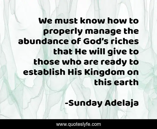 This page presents the quote "We must know how to properly manage the abundance of God’s riches that He will give to those who are ready to establish His Kingdom on this earth". Author of this quote is Sunday Adelaja. This quote is about abundance, kingdom, establishment, riches,.