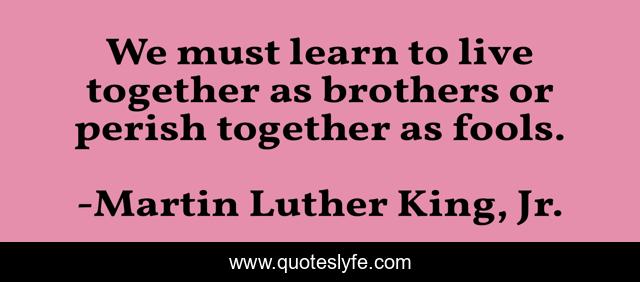 This page presents the quote "We must learn to live together as brothers or perish together as fools.". Author of this quote is Martin Luther King, Jr.. This quote is about live, together, learn,.