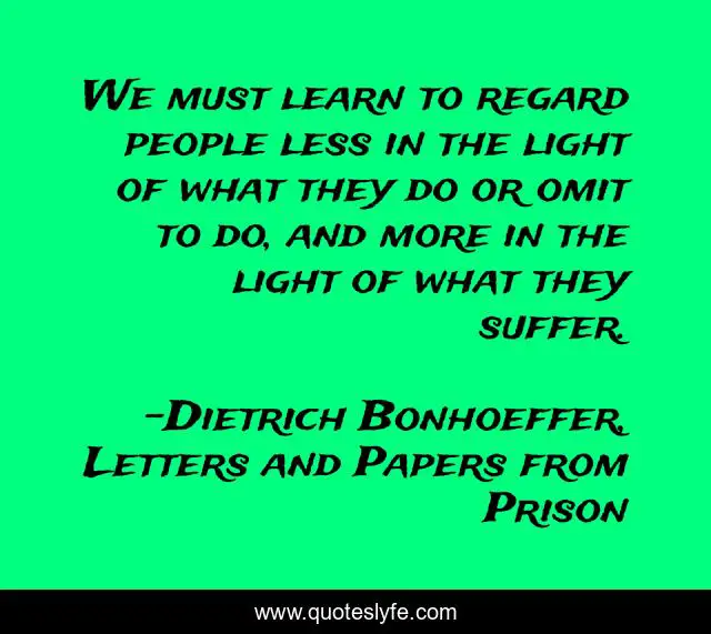 This page presents the quote "We must learn to regard people less in the light of what they do or omit to do, and more in the light of what they suffer.". Author of this quote is Dietrich Bonhoeffer, Letters and Papers from Prison. This quote is about compassion, suffering, kindness, understanding-others, empathy,.