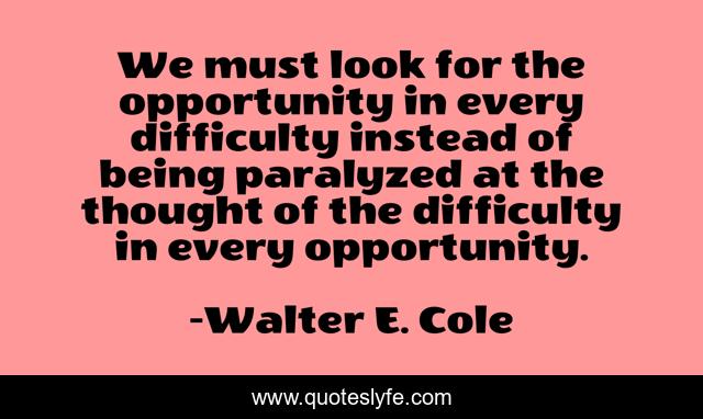 This page presents the quote "We must look for the opportunity in every difficulty instead of being paralyzed at the thought of the difficulty in every opportunity.". Author of this quote is Walter E. Cole. .