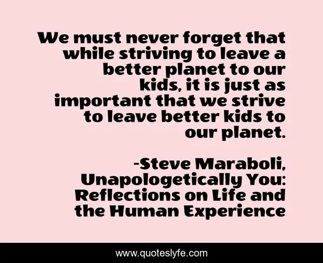 This page presents the quote "We must never forget that while striving to leave a better planet to our kids, it is just as important that we strive to leave better kids to our planet.". Author of this quote is Steve Maraboli, Unapologetically You: Reflections on Life and the Human Experience. This quote is about planet, life, kids,.