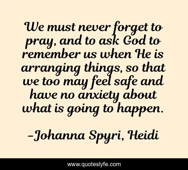 This page presents the quote "We must never forget to pray, and to ask God to remember us when He is arranging things, so that we too may feel safe and have no anxiety about what is going to happen.". Author of this quote is Johanna Spyri, Heidi. This quote is about pray, god, peace, prayer,.