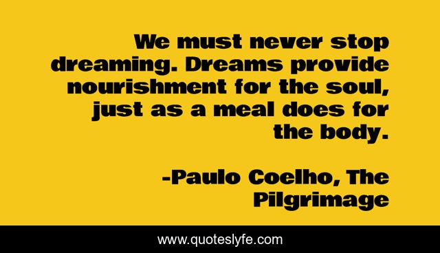 This page presents the quote "We must never stop dreaming. Dreams provide nourishment for the soul, just as a meal does for the body.". Author of this quote is Paulo Coelho, The Pilgrimage. This quote is about nourishment, soul, dreams,.