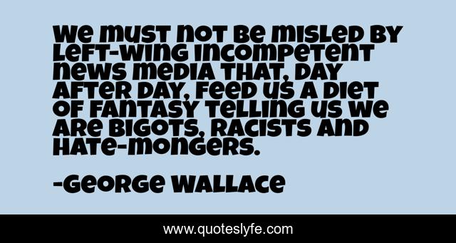 This page presents the quote "We must not be misled by left-wing incompetent news media that, day after day, feed us a diet of fantasy telling us we are bigots, racists and hate-mongers.". Author of this quote is George Wallace. This quote is about media, day, fantasy,.
