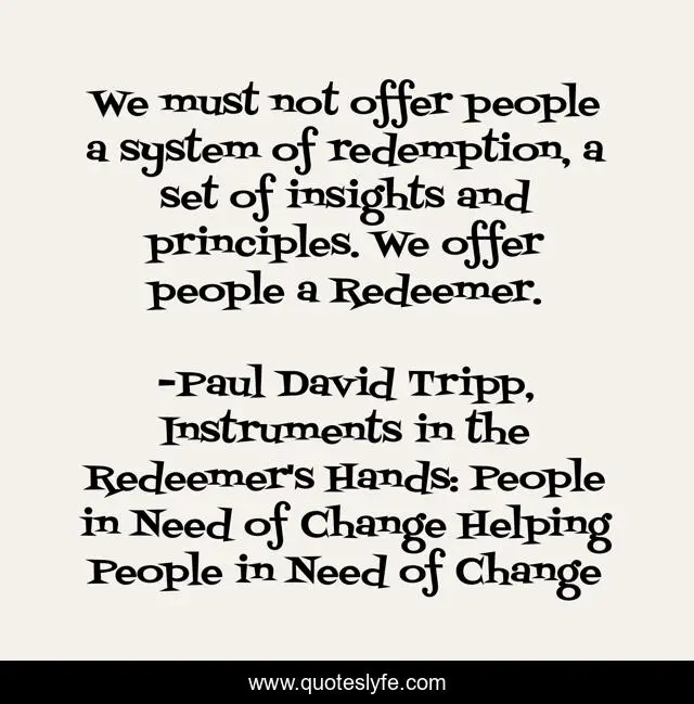 This page presents the quote "We must not offer people a system of redemption, a set of insights and principles. We offer people a Redeemer.". Author of this quote is Paul David Tripp, Instruments in the Redeemer's Hands: People in Need of Change Helping People in Need of Change. This quote is about redemption, people, paul-david-tripp, principles, system, redeemer, insights,.