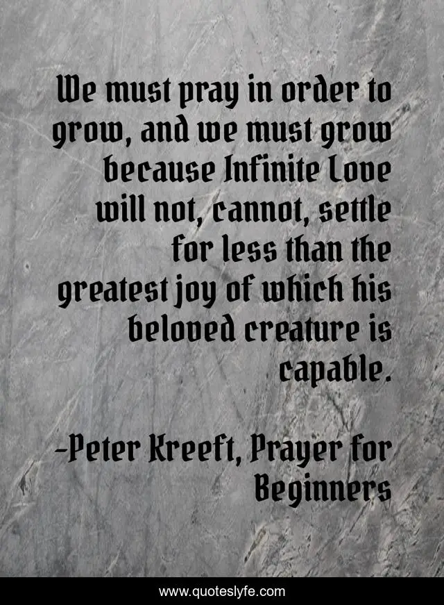 This page presents the quote "We must pray in order to grow, and we must grow because Infinite Love will not, cannot, settle for less than the greatest joy of which his beloved creature is capable.". Author of this quote is Peter Kreeft, Prayer for Beginners. This quote is about faith, love, god, joy, prayer, affection,.