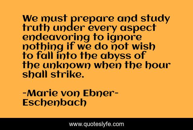 This page presents the quote "We must prepare and study truth under every aspect endeavoring to ignore nothing if we do not wish to fall into the abyss of the unknown when the hour shall strike.". Author of this quote is Marie von Ebner-Eschenbach. .