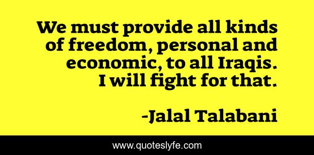 This page presents the quote "We must provide all kinds of freedom, personal and economic, to all Iraqis. I will fight for that.". Author of this quote is Jalal Talabani. This quote is about personal, economic, fight,.