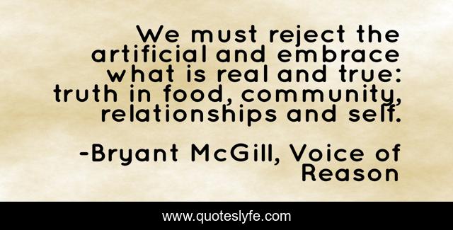This page presents the quote "We must reject the artificial and embrace what is real and true: truth in food, community, relationships and self.". Author of this quote is Bryant McGill, Voice of Reason. This quote is about reality-of-life, eye-opening, awakening, realization, truth-of-life, mind-opening, awareness,.