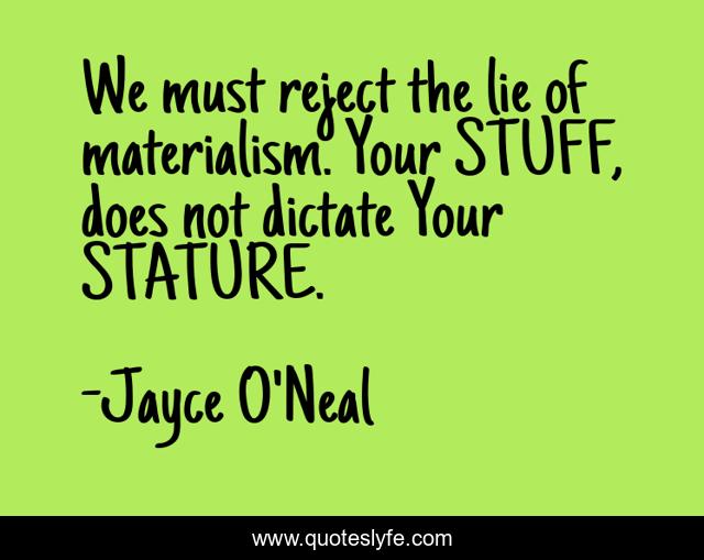 This page presents the quote "We must reject the lie of materialism. Your STUFF, does not dictate Your STATURE.". Author of this quote is Jayce O'Neal. This quote is about christian-life, counter-culture, materialism,.