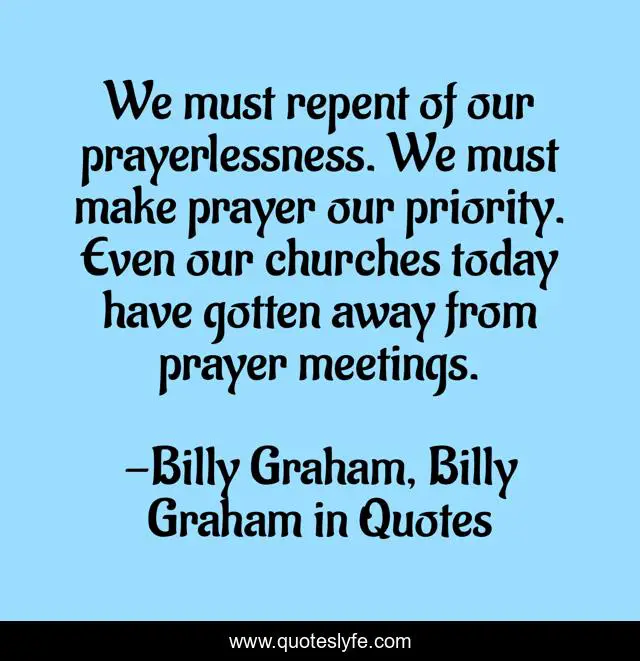 This page presents the quote "We must repent of our prayerlessness. We must make prayer our priority. Even our churches today have gotten away from prayer meetings.". Author of this quote is Billy Graham, Billy Graham in Quotes. This quote is about billy-graham, prayer,.