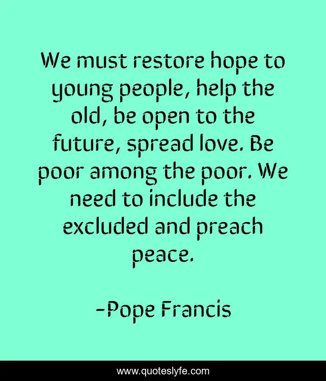 This page presents the quote "We must restore hope to young people, help the old, be open to the future, spread love. Be poor among the poor. We need to include the excluded and preach peace.". Author of this quote is Pope Francis. This quote is about future, love, peace, affection,.