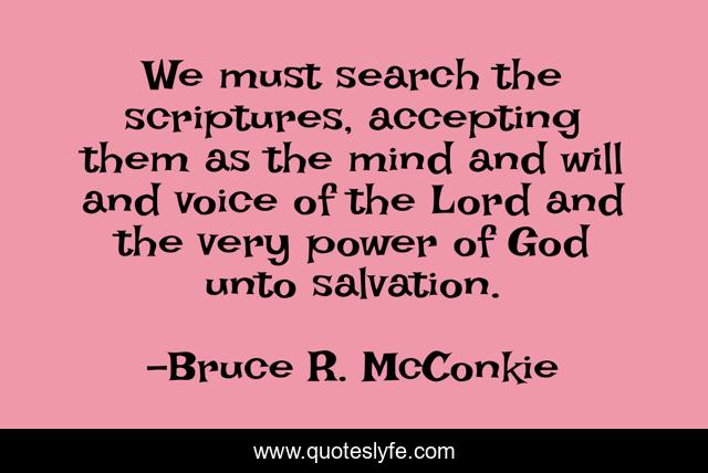 This page presents the quote "We must search the scriptures, accepting them as the mind and will and voice of the Lord and the very power of God unto salvation.". Author of this quote is Bruce R. McConkie. This quote is about god, acceptance, salvation, scriptures, lord,.
