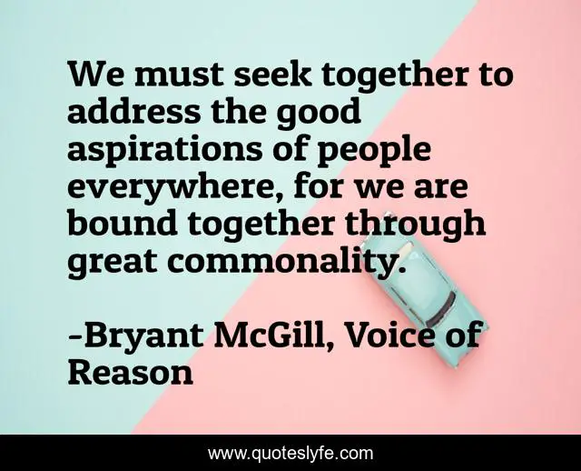 This page presents the quote "We must seek together to address the good aspirations of people everywhere, for we are bound together through great commonality.". Author of this quote is Bryant McGill, Voice of Reason. This quote is about aspiration, commonality, destiny, hope,.