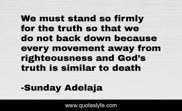 This page presents the quote "We must stand so firmly for the truth so that we do not back down because every movement away from righteousness and God’s truth is similar to death". Author of this quote is Sunday Adelaja. This quote is about prosperity, righteousness, death, wealth, god, away, riches, back, down,.