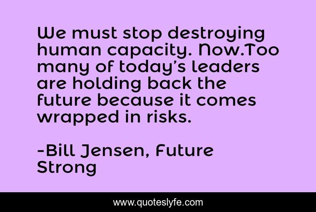 This page presents the quote "We must stop destroying human capacity. Now.Too many of today’s leaders are holding back the future because it comes wrapped in risks.". Author of this quote is Bill Jensen, Future Strong. This quote is about enthusiasm, future, leadership, inspirational, self-help,.