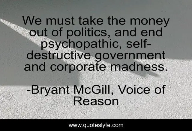 This page presents the quote "We must take the money out of politics, and end psychopathic, self-destructive government and corporate madness.". Author of this quote is Bryant McGill, Voice of Reason. This quote is about corruption-and-attitude, love, peace, improvement, unity, understanding, affection,.