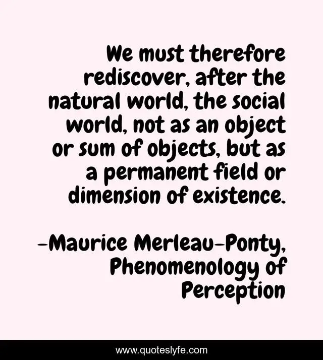 This page presents the quote "We must therefore rediscover, after the natural world, the social world, not as an object or sum of objects, but as a permanent field or dimension of existence.". Author of this quote is Maurice Merleau-Ponty, Phenomenology of Perception. This quote is about perception, connectedness, reality,.