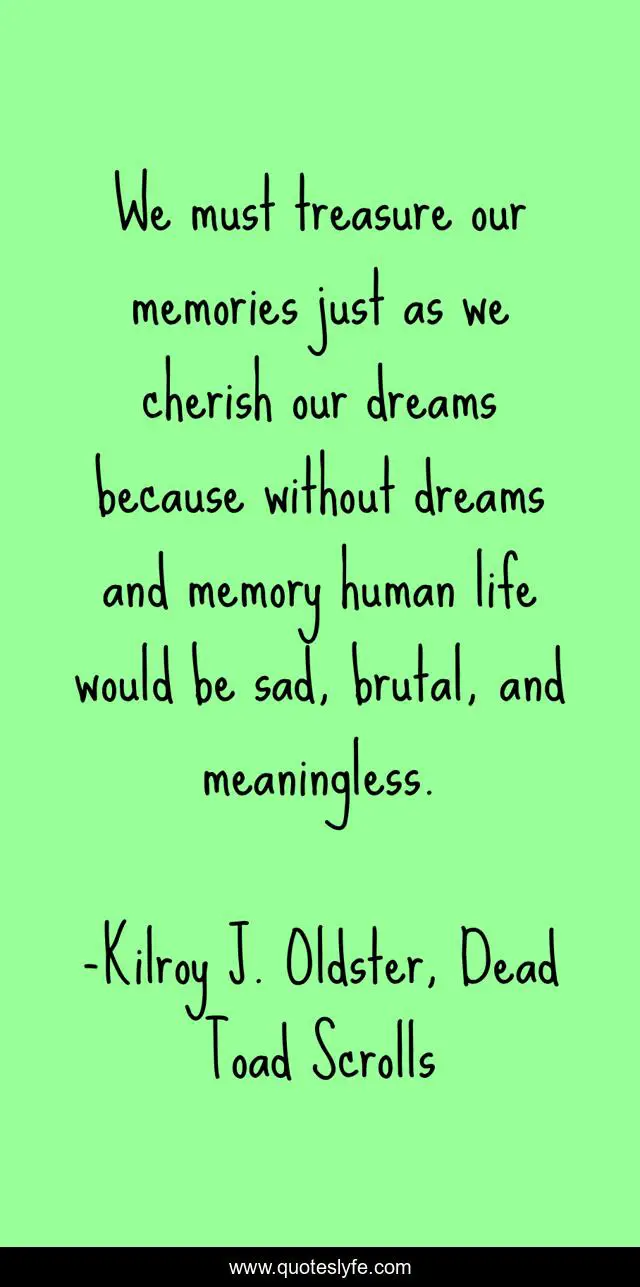 This page presents the quote "We must treasure our memories just as we cherish our dreams because without dreams and memory human life would be sad, brutal, and meaningless.". Author of this quote is Kilroy J. Oldster, Dead Toad Scrolls. This quote is about memories, recollections, rememberance, dreams, memory,.