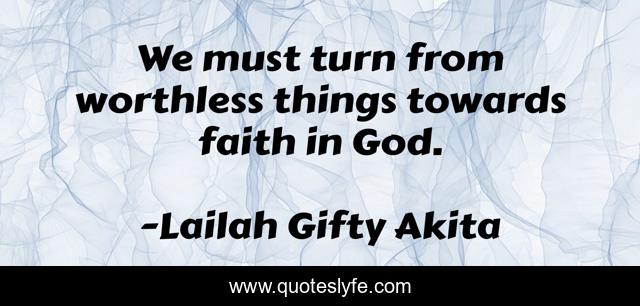 This page presents the quote "We must turn from worthless things towards faith in God.". Author of this quote is Lailah Gifty Akita. This quote is about faith, wise-words, repentance, christian, vanity,.