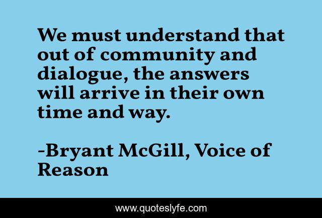 This page presents the quote "We must understand that out of community and dialogue, the answers will arrive in their own time and way.". Author of this quote is Bryant McGill, Voice of Reason. This quote is about love, conversation, understanding, patience, affection, hope, care,.