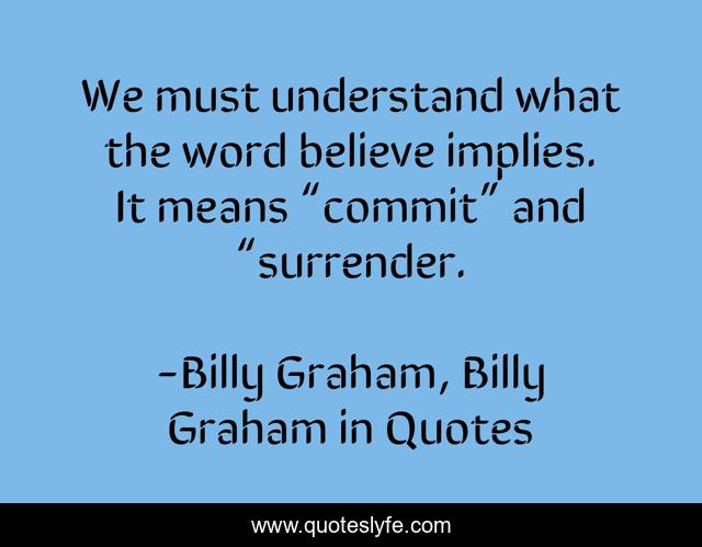 This page presents the quote "We must understand what the word believe implies. It means “commit” and “surrender.". Author of this quote is Billy Graham, Billy Graham in Quotes. This quote is about surrender, billy-graham,.