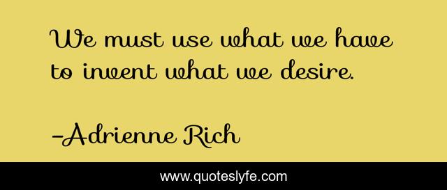 This page presents the quote "We must use what we have to invent what we desire.". Author of this quote is Adrienne Rich. This quote is about self, knowledge,.