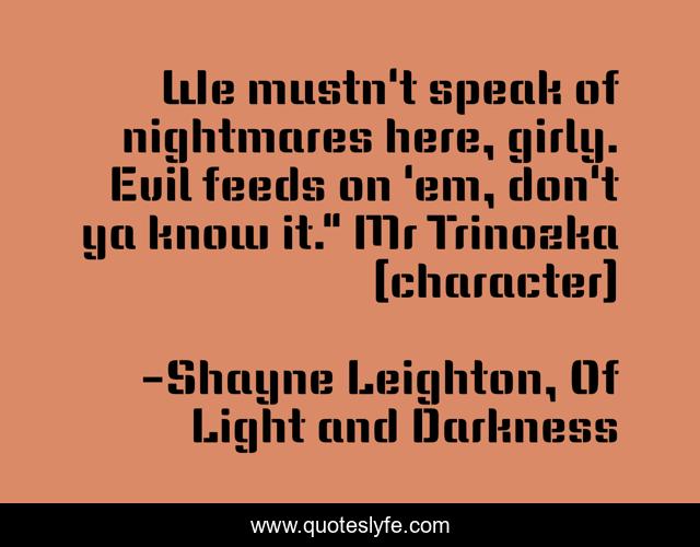 This page presents the quote "We mustn't speak of nightmares here, girly. Evil feeds on 'em, don't ya know it." Mr Trinozka (character)". Author of this quote is Shayne Leighton, Of Light and Darkness. .