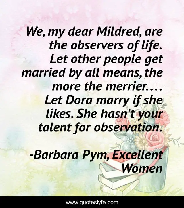 This page presents the quote "We, my dear Mildred, are the observers of life. Let other people get married by all means, the more the merrier. . . . Let Dora marry if she likes. She hasn't your talent for observation.". Author of this quote is Barbara Pym, Excellent Women. .