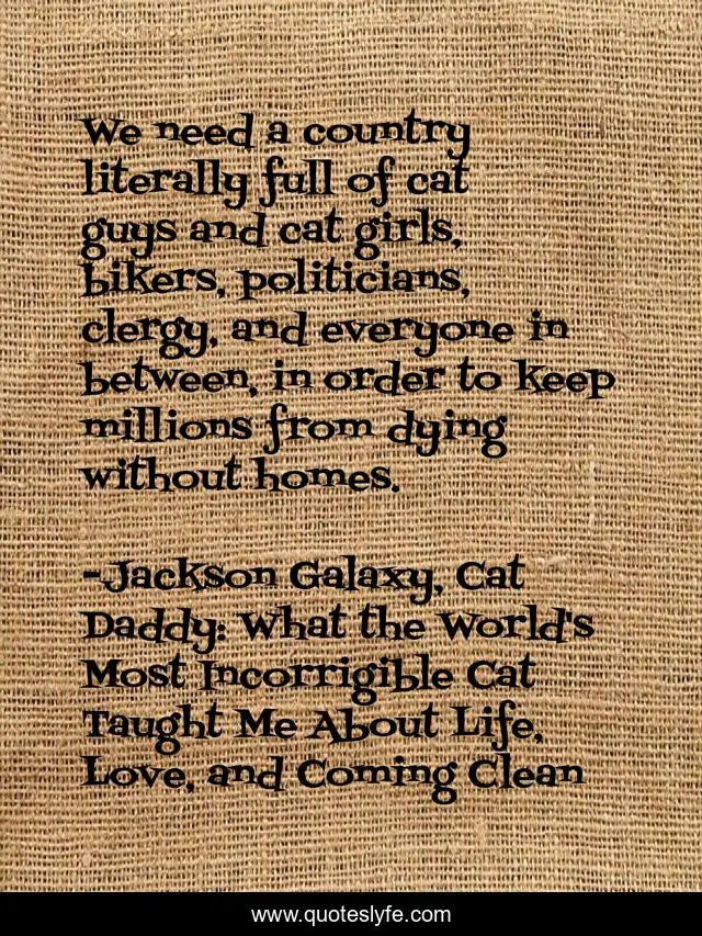 This page presents the quote "We need a country literally full of cat guys and cat girls, bikers, politicians, clergy, and everyone in between, in order to keep millions from dying without homes.". Author of this quote is Jackson Galaxy, Cat Daddy: What the World's Most Incorrigible Cat Taught Me About Life, Love, and Coming Clean. .