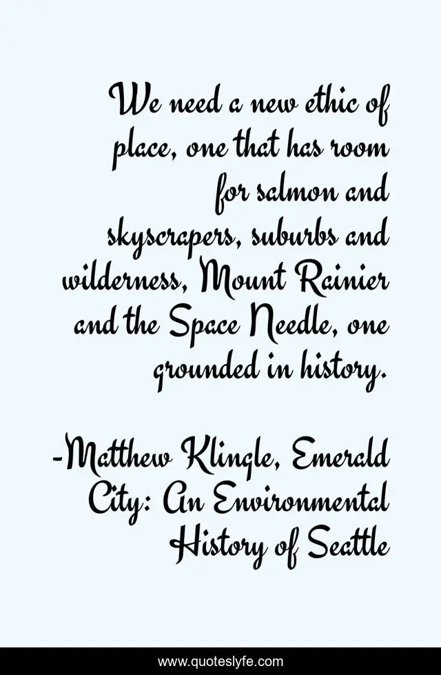 This page presents the quote "We need a new ethic of place, one that has room for salmon and skyscrapers, suburbs and wilderness, Mount Rainier and the Space Needle, one grounded in history.". Author of this quote is Matthew Klingle, Emerald City: An Environmental History of Seattle. This quote is about salmon, sustainability, future, pacific-northwest, seattle, history,.