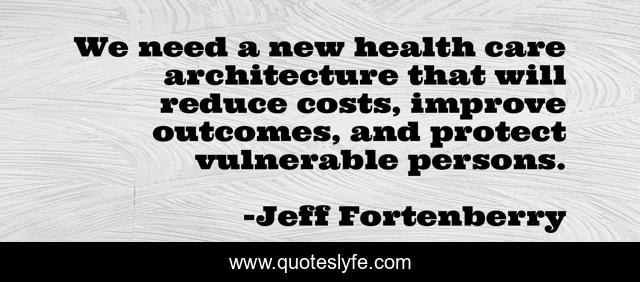 This page presents the quote "We need a new health care architecture that will reduce costs, improve outcomes, and protect vulnerable persons.". Author of this quote is Jeff Fortenberry. This quote is about new, health, care,.