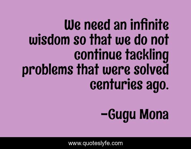 This page presents the quote "We need an infinite wisdom so that we do not continue tackling problems that were solved centuries ago.". Author of this quote is Gugu Mona. This quote is about infinite, centuries, problems, wisdom, solved, need,.